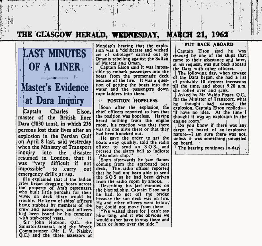 In the matter of a Formal Investigation held at the Chartered Auctioneers' and Estate Agents' Institute, 29 Lincoln's Inn Fields, London, on the 19th, 20th, 21st, 22nd, 23rd, 26th, 27th, 28th, 29th and 30th days of March, and the 2nd, 3rd, 4th, 9th and 10th days of April, 1962 before Mr. J. V. Naisby, Q.C., assisted by Captain H. S. Hewson, Captain K. A. H. Cummins and Mr. R. H. Wetherall, M.R.I.N.A., M.I. Mar. E., M.N.E. Coast. I.E.S., into the circumstances attending the loss of the m.v. "Dara" in the month of April, 1961, off Dubai in the Persian Gulf.